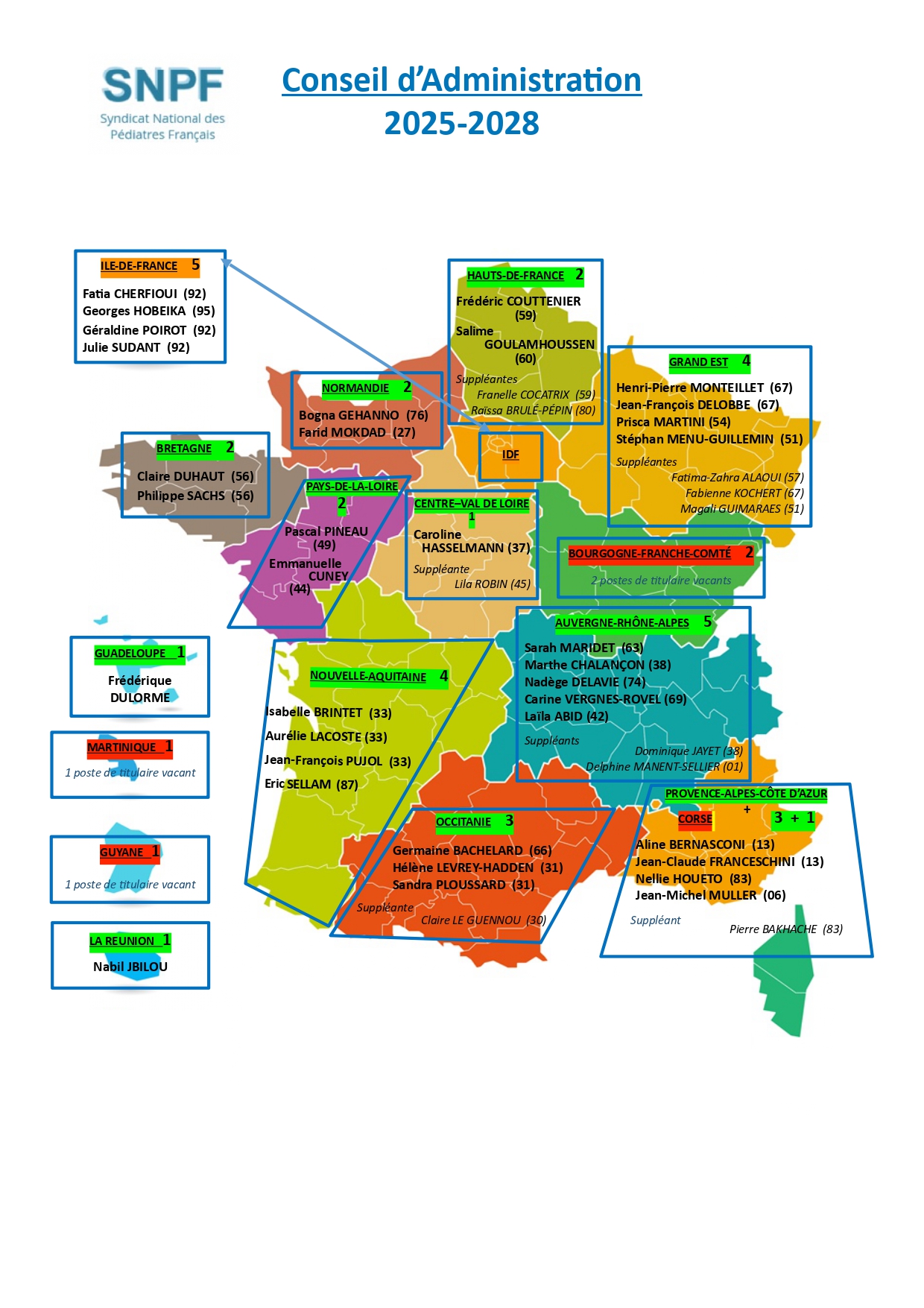 Les membres du Conseil d’Administration représentent le syndicat dans leur région ; ils aident les pédiatres syndiqués dans leurs difficultés quotidiennes, assument la promotion du syndicat et organisent des réunions d’information.